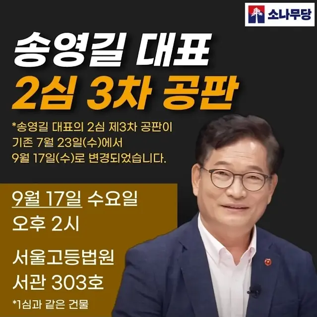 소나무당 송영길 대표 항소심 3차 공판일이 9월 17일로 변경되었습니다. 등록일2025. 07. 23