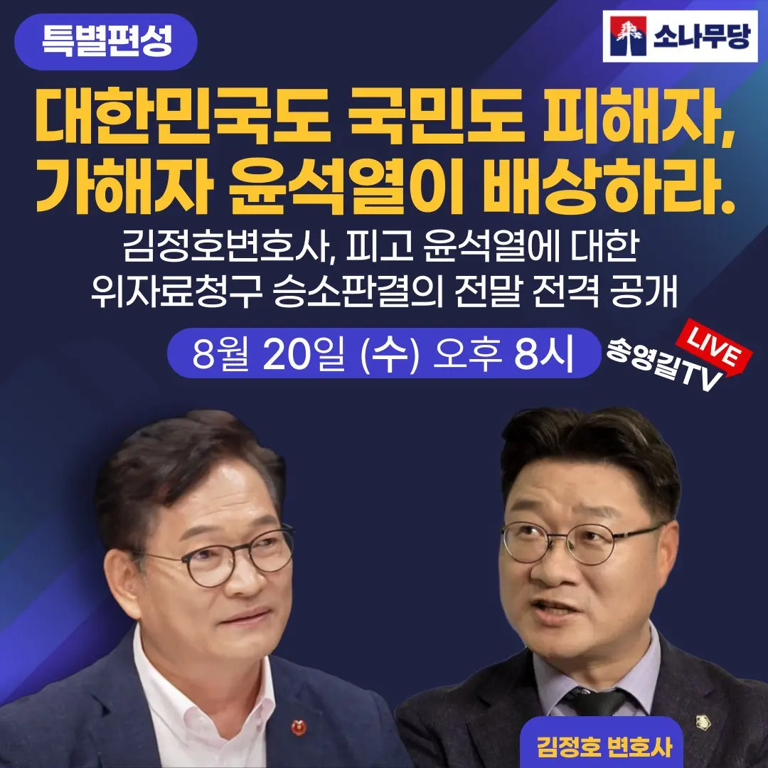 8월 20일 (수) 오후 8시 [송영길tv live] 피고 윤석열에 대한 위자료 청구 승소판결을 이끌어낸 김정호 변호사 전격 출연! "대한민국도 국민도 피해자.