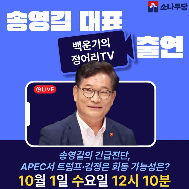 10월 1일 (수) 오후 12시 10분 백운기의 정어리tv 송영길 대표 출연 등록일2025. 10. 01