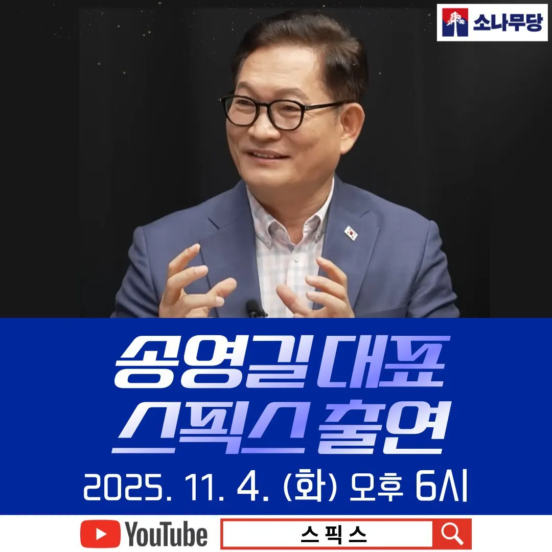 11월 4일(화) 오후6시《스픽스 live》송영길대표 방송출연 안내 등록일2025. 11. 04